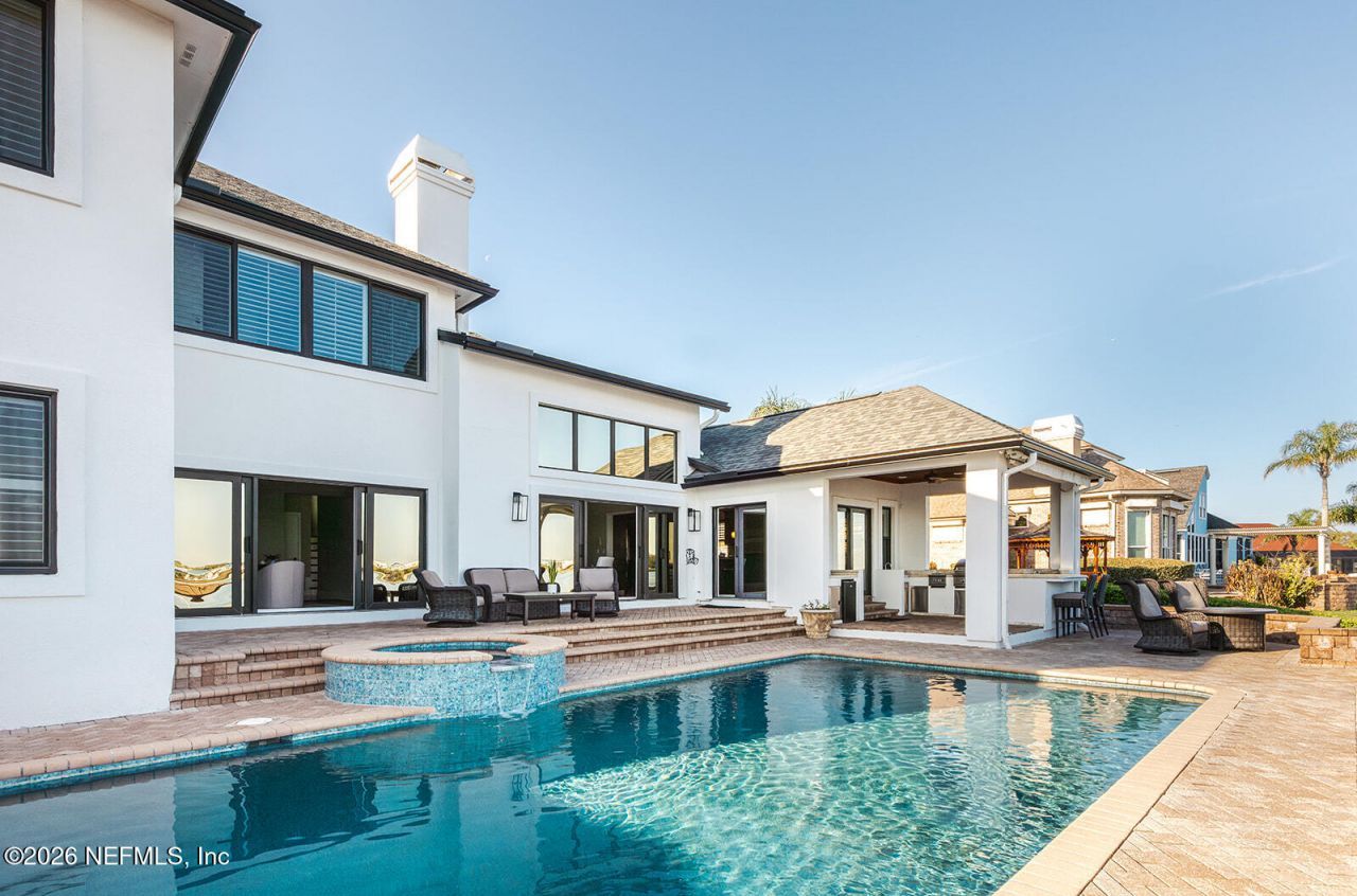 Wake up to sweeping St. Johns River views and the kind of deepwater access boaters dream about, with the Atlantic Ocean just a short boat ride away. Situated on a wide stretch of the river in the 32225 area, this beautifully refreshed 5-bedroom, 4-bath home is designed to capture the water from nearly every room. Soaring ceilings and walls of windows frame stunning river views, while brand new windows fill the home with natural light. The primary suite offers a true retreat with a sunlit sitting room or office overlooking the river and a newly renovated bath. Recent improvements include a new roof, new stucco, fresh interior and exterior paint, updated landscaping, and a resurfaced pool and spa. The private dock features two boat lifts (10,000 lb and 3,500 lb), including a covered lift with power and water, offering rare deep-water access just 7 miles from the ocean. The spacious kitchen features granite countertops, island and bar, and a dining nook for views of the river during dinner. The community also offers a gated community pool, private boat ramp, tennis courts, and boat parking.